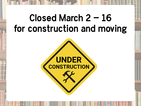 The inside of the library be closed on Monday, March 2 through Monday, March 16 for construction work in the lobby and while we move the youth materials back up to the main level.